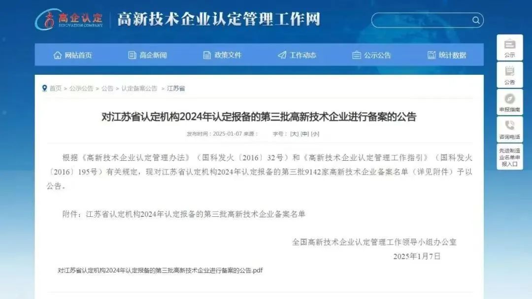 近日,江苏省认定机构2024年认定报备的第三批高新技术企业备案名单出炉,南京晨光公司再次通过“高新技术企业”认定。此次入选标志着公司在核心自主知识产权、科技成果转化能力等方面得到国家相关部门的肯定与认可。