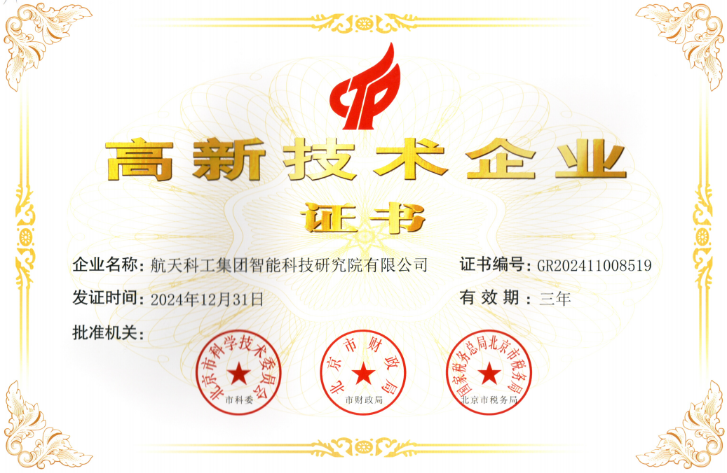 近日,航天智能院顺利通过了“国家级高新技术企业”首次认定,获得高新技术企业证书,标志着航天智能院科技创新、知识产权、科技产品研发以及产品服务等方面的能力受到认可。
