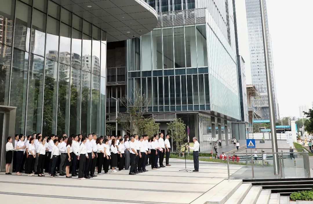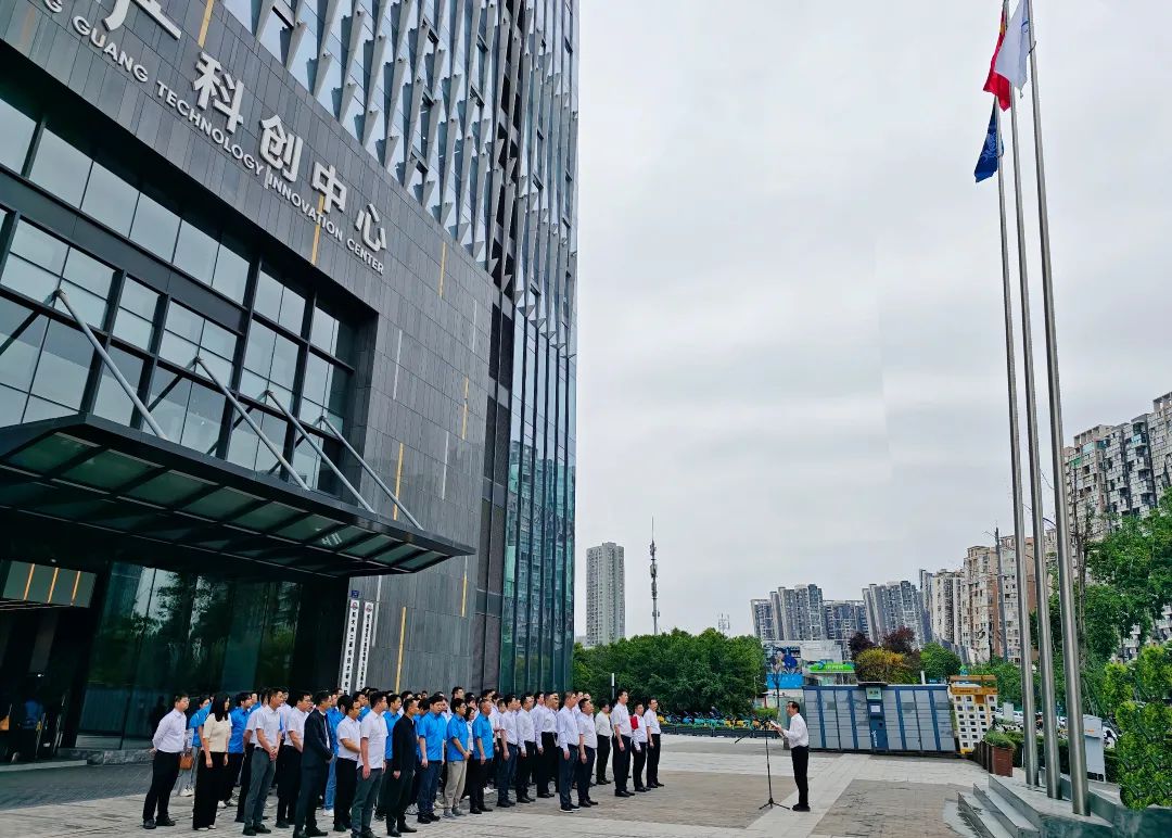 现场,在嘹亮的国歌声中,鲜艳的五星红旗冉冉升起。在激昂的集团公司司歌声中,司旗迎风飘扬。