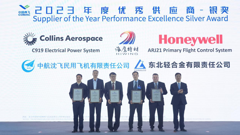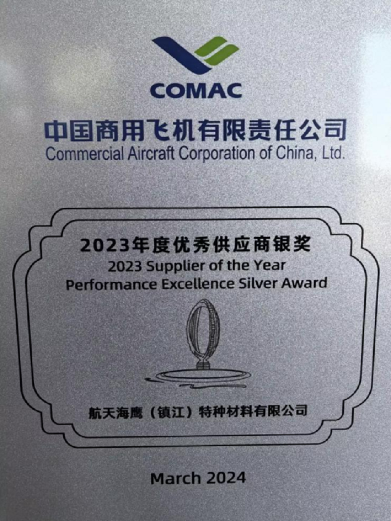 会议期间,中国商飞对2023年优秀供应商进行了表彰,海鹰特材荣获“2023年度优秀供应商银奖”,此奖项充分肯定了2023年海鹰特材在C919批产交付中的重要贡献以及在批产提速规划中的积极表现。大会还通报了民用飞机市场分析、中国商飞公司市场营销情况,