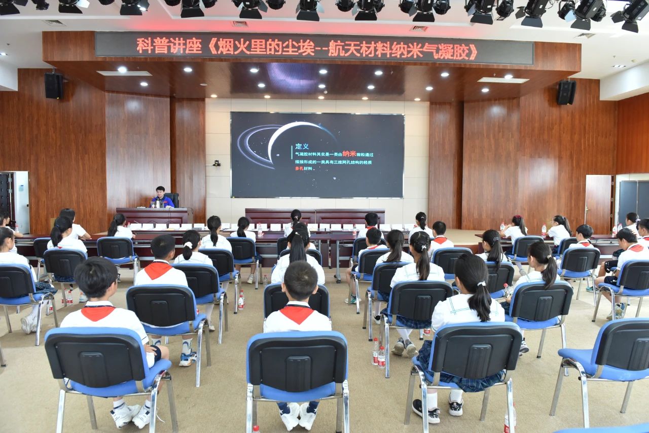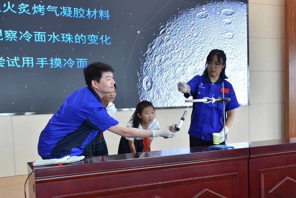 升旗仪式结束后,306所青年科技工作者廖博士为云岗小学师生带来了一堂题为《烟火里的尘埃——航天材料纳米气凝胶》的科普课。课堂上,通过趣味讲解、实物展示、模拟试验、互动问答等形式,对这种已经成功运用于长征五号运载火箭、嫦娥四号月球探测器等航天器上的新型航天材料进行了现场揭秘,并为同学们介绍了气凝胶研制团队不为人知的研发故事。互动环节,学生们走上讲台亲自操作实验仪器,零距离验证气凝胶材料的优异性能。在充满乐趣的课堂上,同学们学习了航天知识,感受到航天科技的魅力。