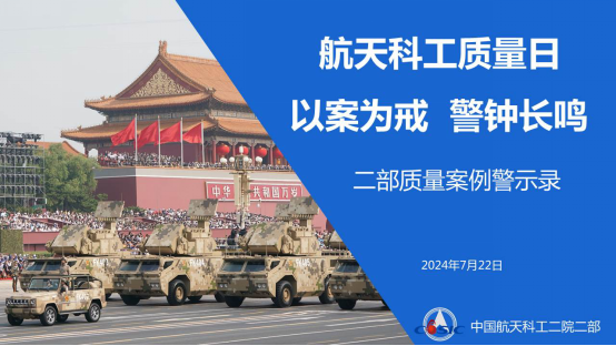 为全面贯彻习近平强军思想,围绕“四个确保”新时期质量工作方针,落实集团公司关于开展2024年航天科工质量日主题活动的要求,航天二院二部日前积极组织开展了主题为“以案为鉴,警钟长鸣,全面强固产品质量”的航天科工质量日系列活动,推动全员进一步认清严峻质量形势,始终坚持质量至上,贯彻“质量就是生命、质量就是胜算”的理念,持续强化总体部质量责任担当。
