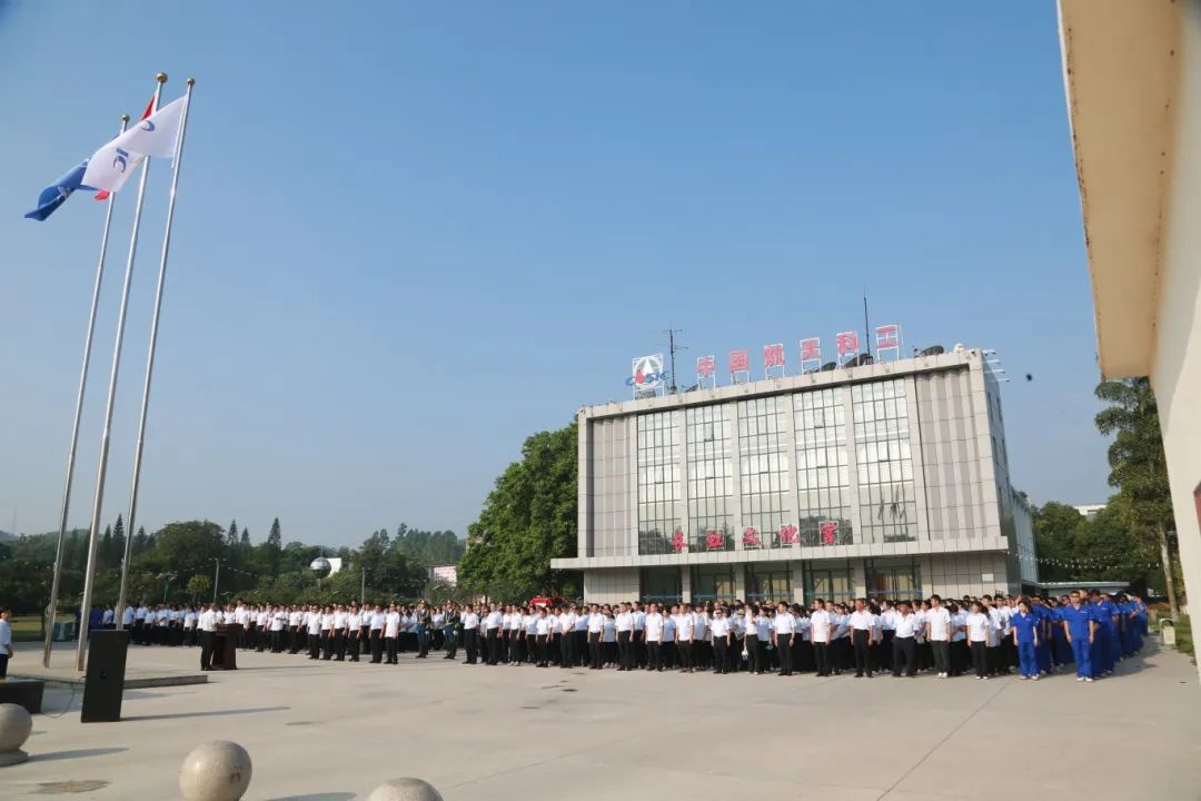 伴随着雄壮的国歌,鲜艳的五星红旗冉冉升起、高高飘扬,在激昂的航天科工之歌旋律中,集团公司司旗徐徐上升、迎风招展。全场干部职工庄严肃立,行注目礼。