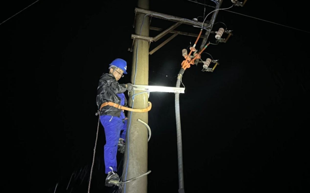 保障组人员脚蹬爬杆器,一步一步爬上横担,固定好安全绳,经过多点巡查,他们迅速定位故障,查明是因为受雷雨天气影响,架空线路上的避雷器被击穿导致线路单相接地。