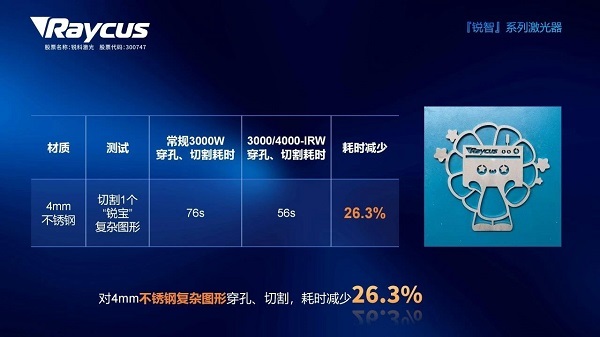 使用常规3000W激光器和锐智系列3000/4000-IRW激光器对4mm不锈钢进行复杂图形穿孔、切割,其中常规3000W激光器耗时76s,锐智系列3000/4000-IRW激光器耗时56s,耗时相比减少26.3%。