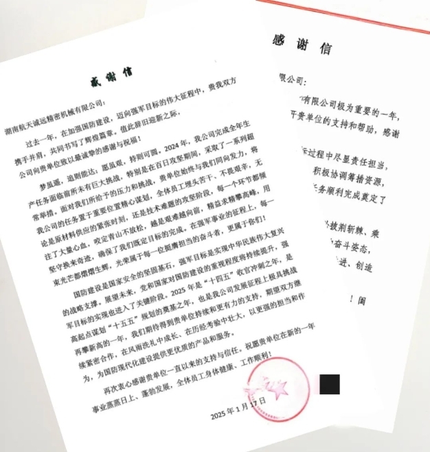 2025年农历年到来之际,湖南航天诚远公司陆续收到客户单位发来的感谢信。