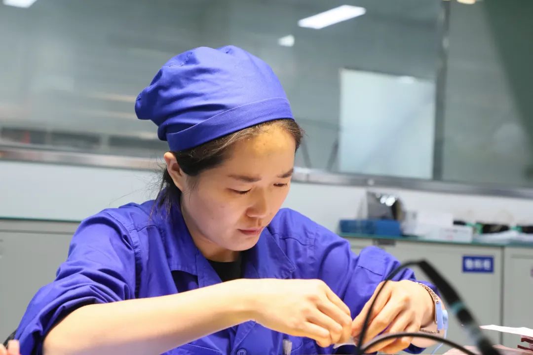 作为电装中心的“王牌导师”,小徐凭借精湛技艺和耐心教导,培养出一批批骨干。她不仅以身作则,以专注严谨的态度投入工作,更会在徒弟们疲惫时暖心鼓劲:“加把劲,我们一定能完成。”在这样团结奋进的氛围中,大家争分夺秒、你追我赶,全力推动生产进度。