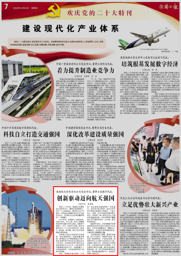 党的二十大代表,湖南航天有限责任公司党委书记、董事长焦继革表示,党的二十大报告提出,建设现代化产业体系。这传递出我国建设现代化产业体系的决心,更为航天企业的高质量发展按下“快进键”。