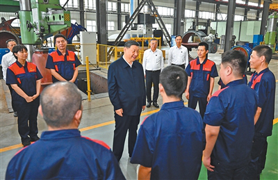 7月7日至8日,中共中央总书记、国家主席、中央军委主席习近平在山西考察。这是7日下午,习近平在阳泉阀门股份有限公司考察时,同企业员工亲切交流。新华社记者燕雁摄