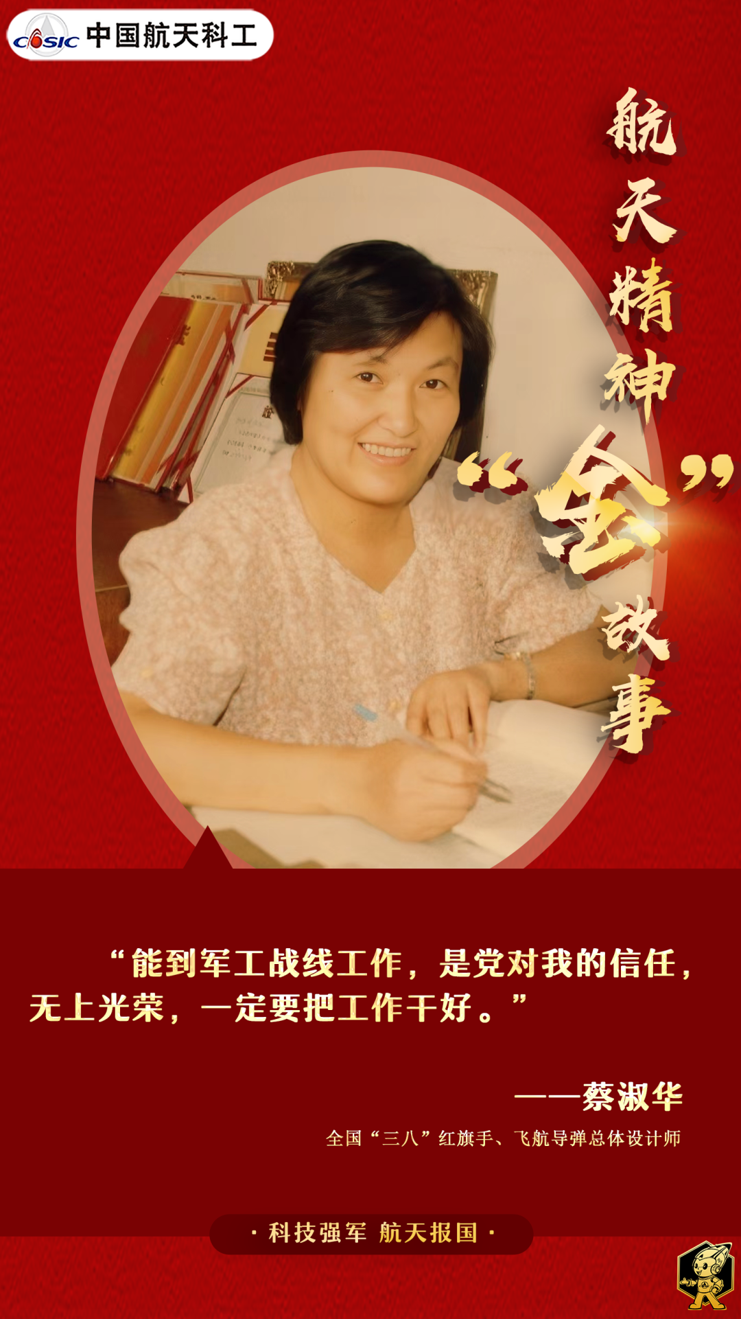 惊涛骇浪中,她把自己绑在船舰设备上,像在告诉我们:如何将自己的一生牢牢绑定中国航天。择一业,终一生。既然选择了国防军工和航天事业,那就必须义无反顾、奋勇向前!谁说女子不如男?像蔡淑华一样负重拼搏、敢为一流的巾帼英雄,正英姿飒爽,亮剑疆场!