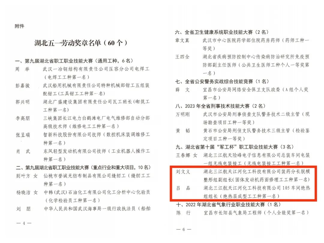 近日,从湖北省总工会《关于2022年-2023年部分专项活动先进个人和集体授予湖北五一劳动奖章和湖北省工人先锋号的通报》(鄂工字[2023]59号文)获悉,中国航天科工六院江河公司职工吕品和刘文义因在湖北省第十届“军工杯”职工职业技能大赛中获第一名,被授予“湖北五一劳动奖章”殊荣。