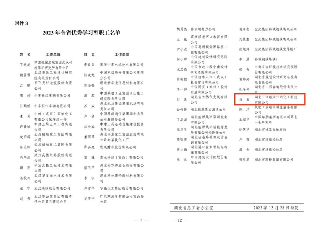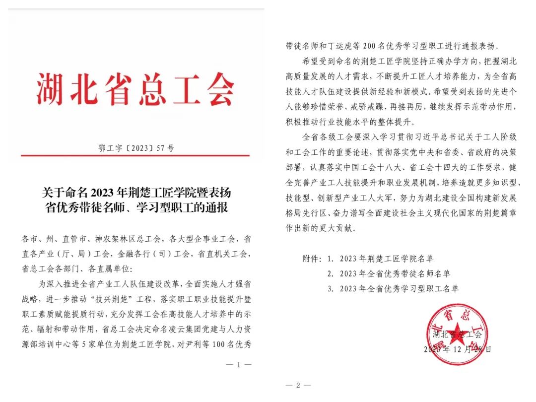 同时,从湖北省总工会《关于命名2023年荆楚工匠学院暨表扬省级优秀带徒名师、学习型职工的通报》(鄂工字[2023]57号文)获悉,公司职工吕品喜获2023年湖北省“优秀学习型职工”荣誉称号。