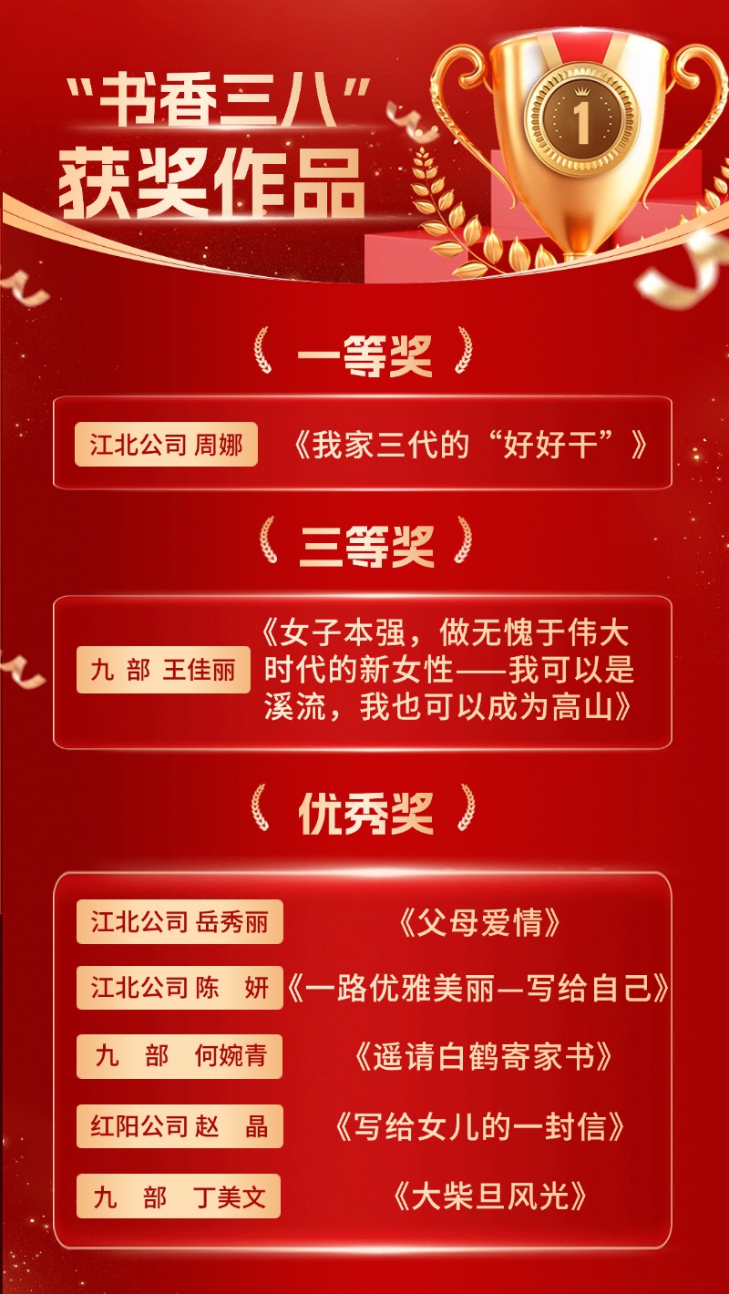 近日,全国第十二届“书香三八”读书活动获奖名单揭晓,航天科工九院工会委员会获得“优秀组织奖”,个人获奖作品7篇,其中一等奖1篇、三等奖1篇、优秀奖5篇。