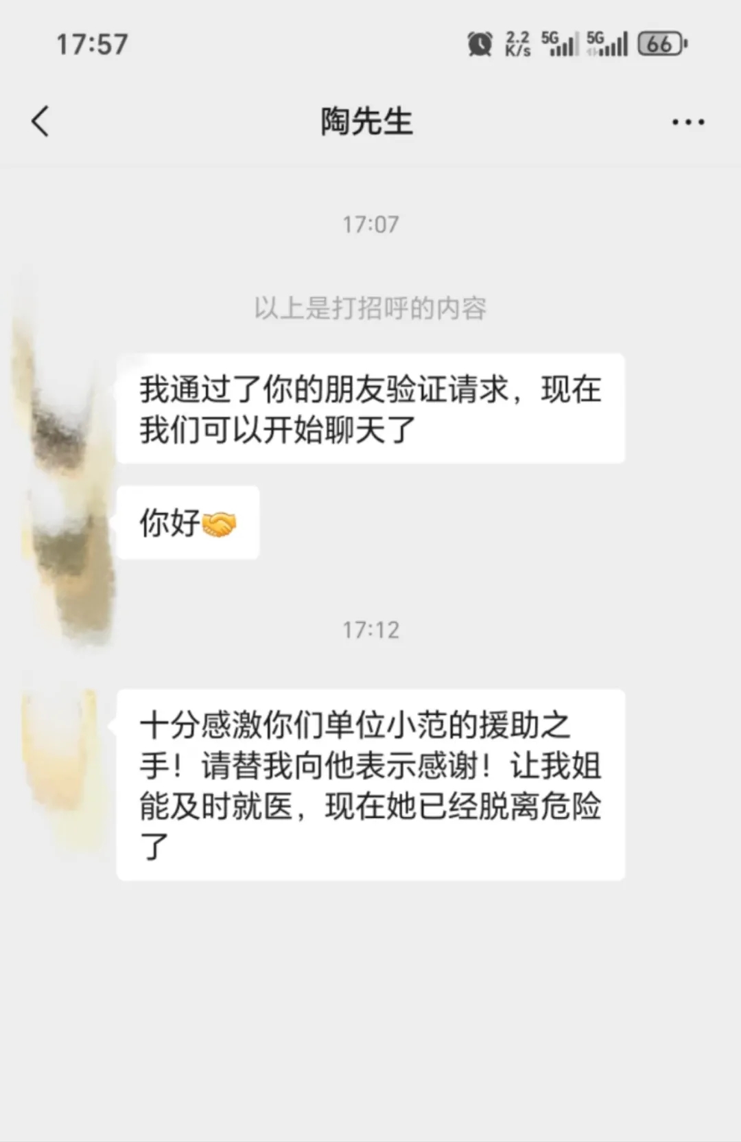 后续,伤者家属联系上了单位,并对范爱平见义勇为之举表示感谢。从伤者家属口中得知,受伤女子早上骑车匆忙送女儿上学,不小心摔倒,发生意外。