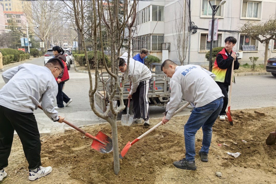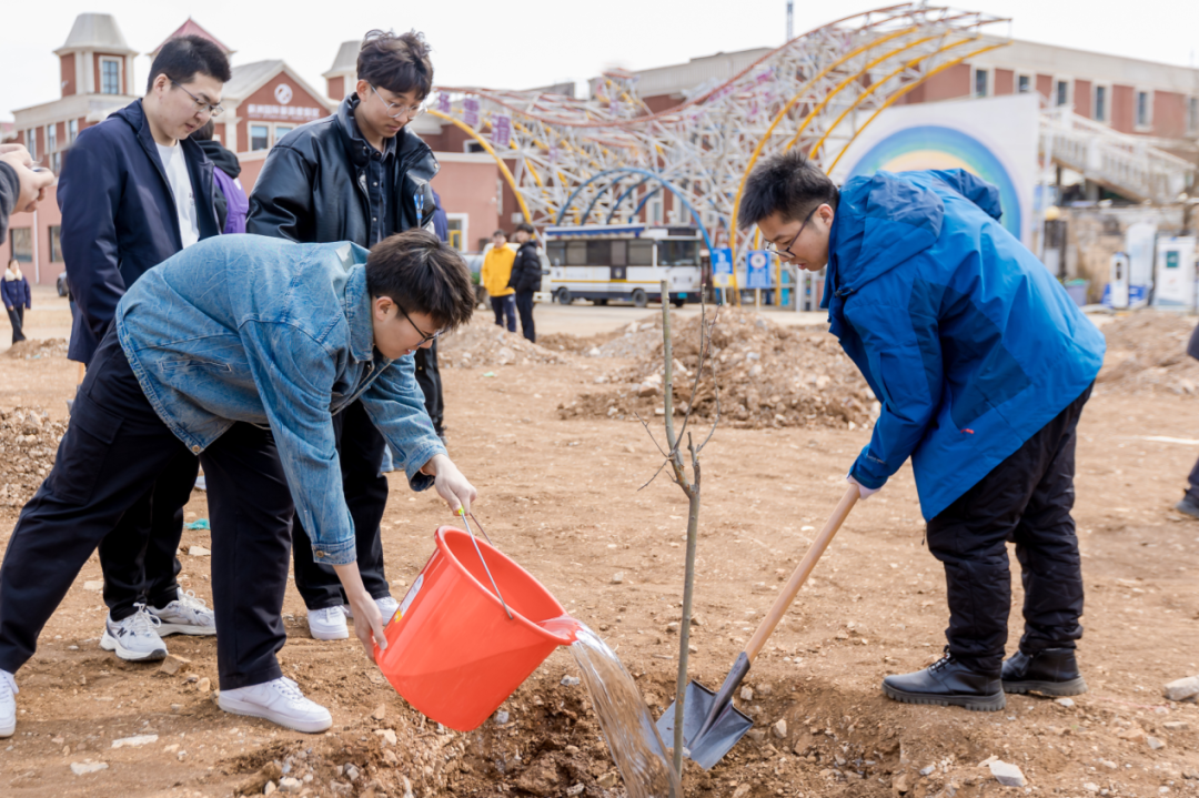 植树现场,春和景明,一片繁忙有序的劳动景象。大家分工协作,默契配合,挥锹铲土、培土围堰、提桶浇水,种下海棠、山楂、牡丹等树苗。在和煦的春风中,一株株树苗错落有致地挺立着,展现出勃勃生机。