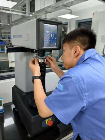 位于701库的性能组实验室里灯火通明,试验机与洛氏硬度计发出持续不断的规律蜂鸣。性能组组长黄姐和组员小王被堆积如山的待检样品包围。每一份样品都需经受严格考验:电子万能试验机上,金属样条被缓缓拉长直至断裂,电脑屏幕实时绘制着反应材料强度的拉伸曲线;洛氏硬度计旁,检测员凝神屏息,在无数样品表面精准施压,记录着一个个硬度数据点。连续数小时高强度操作,手臂早已酸痛难当,目光却依旧如炬,牢牢锁定每一个读数、每一个数据点。